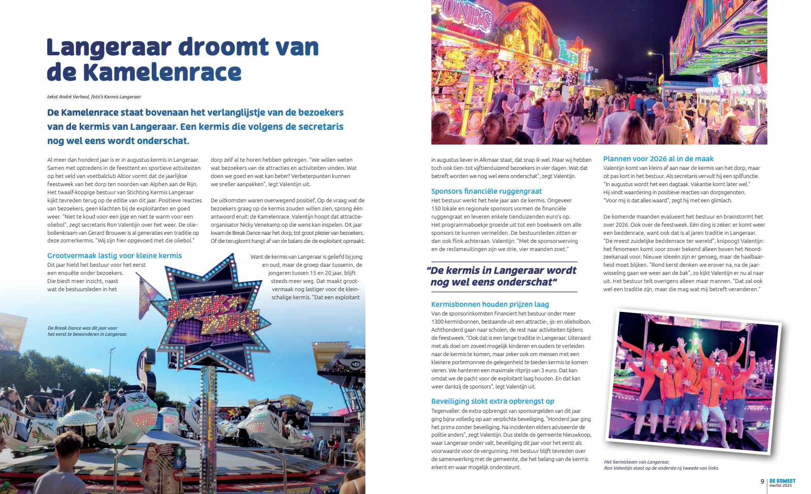 Al meer dan honderd jaar is er in augustus een kermis in Langeraar, het dorp ten noorden van Alphen aan de Rijn. De organiserende stichting buigt zich rond deze tijd al weer over de editie van komend jaar.