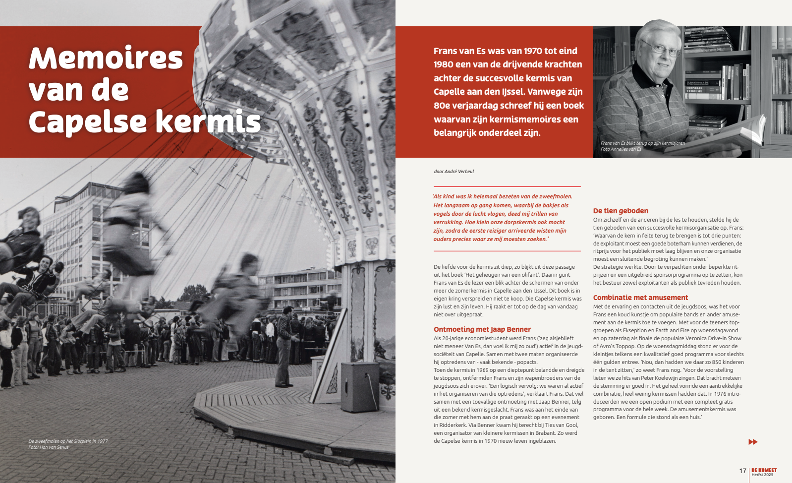 In hetzelfde nummer mijn interview met Frans van Es, wereldberoemd in Capelle aan den IJssel. Aanleiding: zijn memoires van de Capelse kermis die hij jarenlang met groot succes organiseerde.