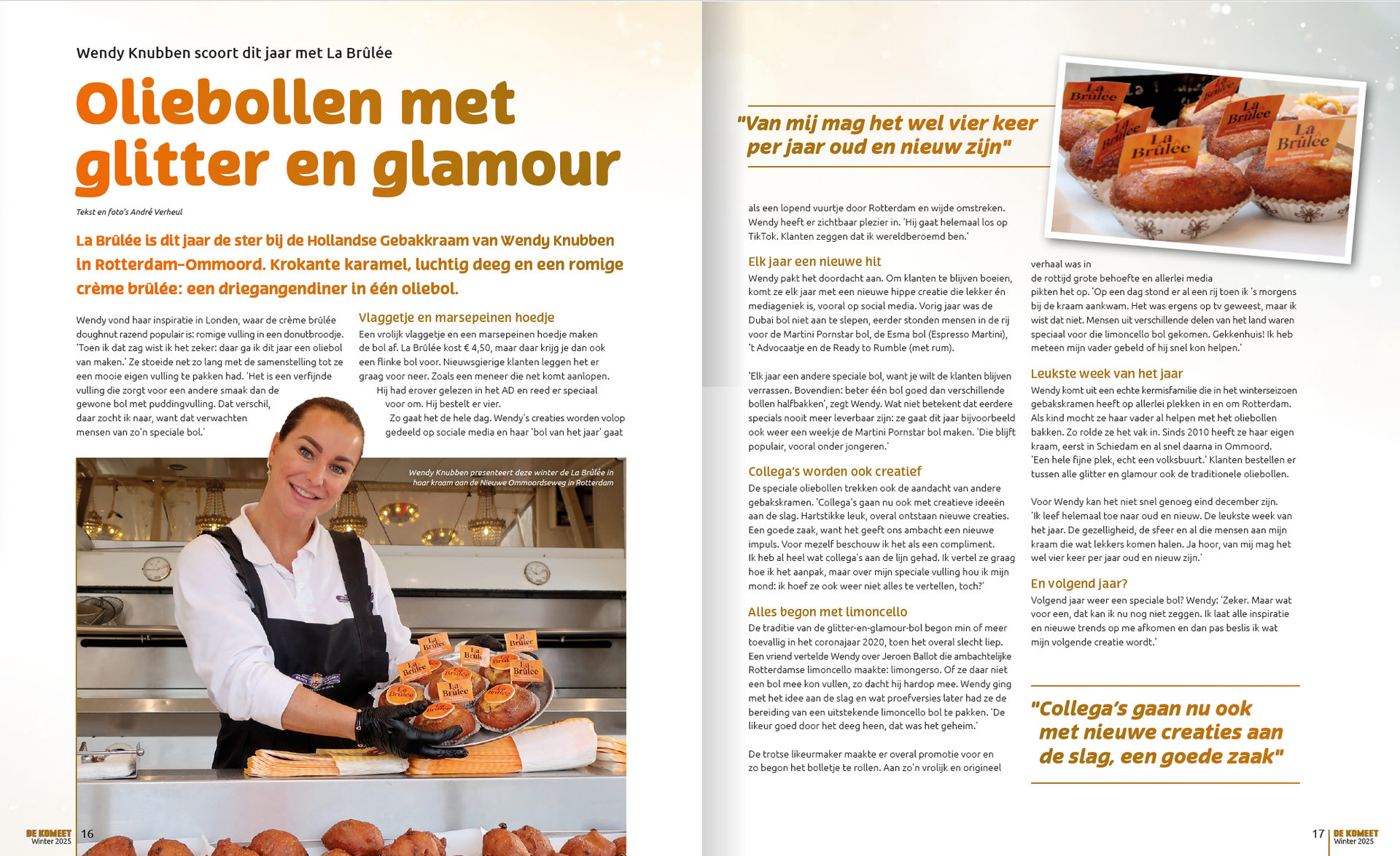 En nu dus de La Brûlée. Krokante karamel, luchtig deeg en een romige crème brûlée: een drietrapsraket van een oliebol. Het interview en de fotoshoot gingen even tussendoor, want de klanten bleven komen - en allemaal wilden ze die La Brûlée wel eens proeven.